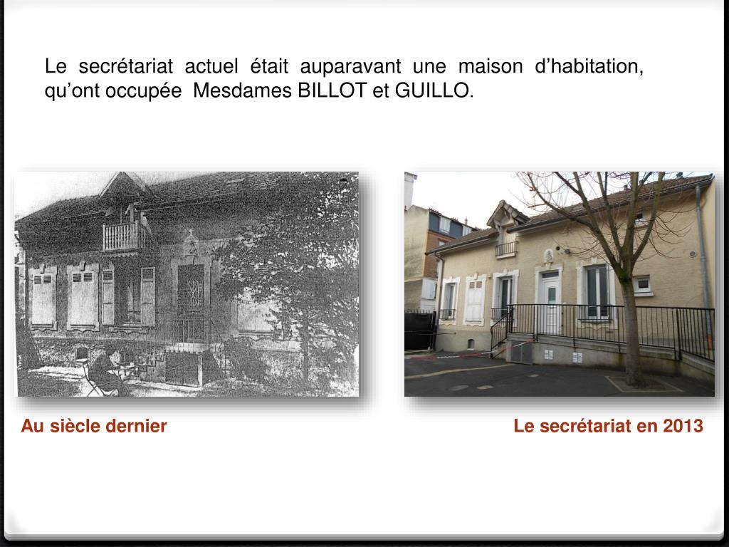Le secrétariat actuel était auparavant une maison d’habitation, qu’ont occupée Mesdames BILLOT et GUILLO. Au siècle dernier Le secrétariat en 2013