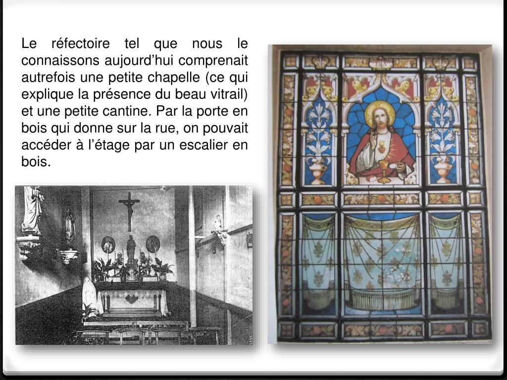 Le réfectoire tel que nous le connaissons aujourd’hui comprenait autrefois une petite chapelle (ce qui explique la présence du beau vitrail) et une petite cantine. Par la porte en bois qui donne sur la rue, on pouvait accéder à l’étage par un escalier en bois.
