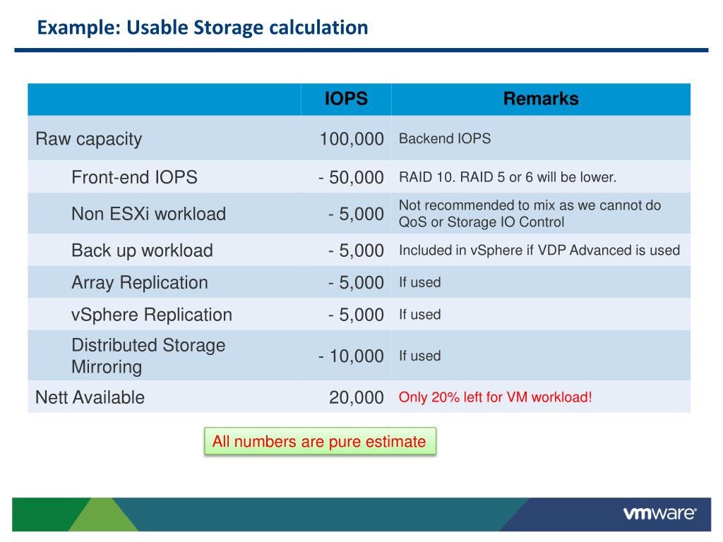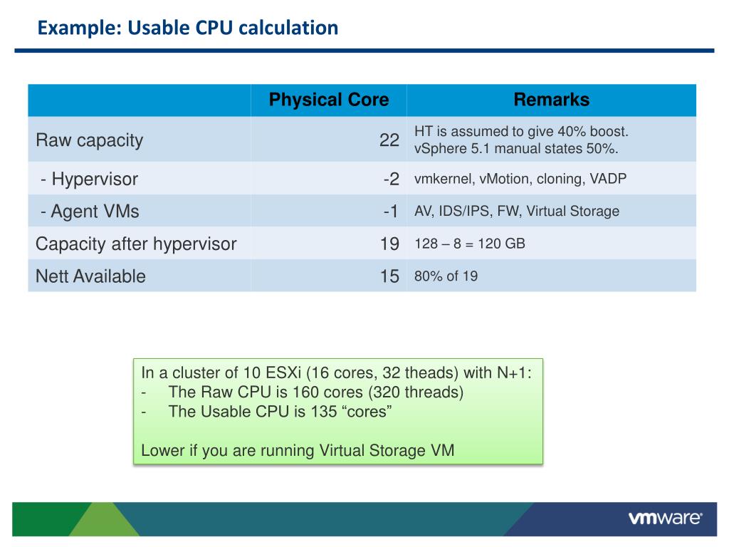 Example: Usable CPU calculation • In a cluster of 10 ESXi (16 cores, 32 theads) with N+1: • The Raw CPU is 160 cores (320 threads) • The Usable CPU is 135 “cores” • Lower if you are running Virtual Storage VM