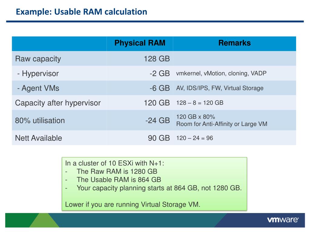 Example: Usable RAM calculation • In a cluster of 10 ESXi with N+1: • The Raw RAM is 1280 GB • The Usable RAM is 864 GB • Your capacity planning starts at 864 GB, not 1280 GB. • Lower if you are running Virtual Storage VM.