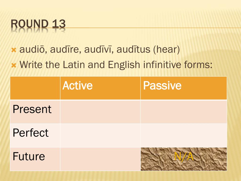 audiō, audīre, audīvī, audītus (hear) Write the Latin and English infinitive forms: Round 13 Answers