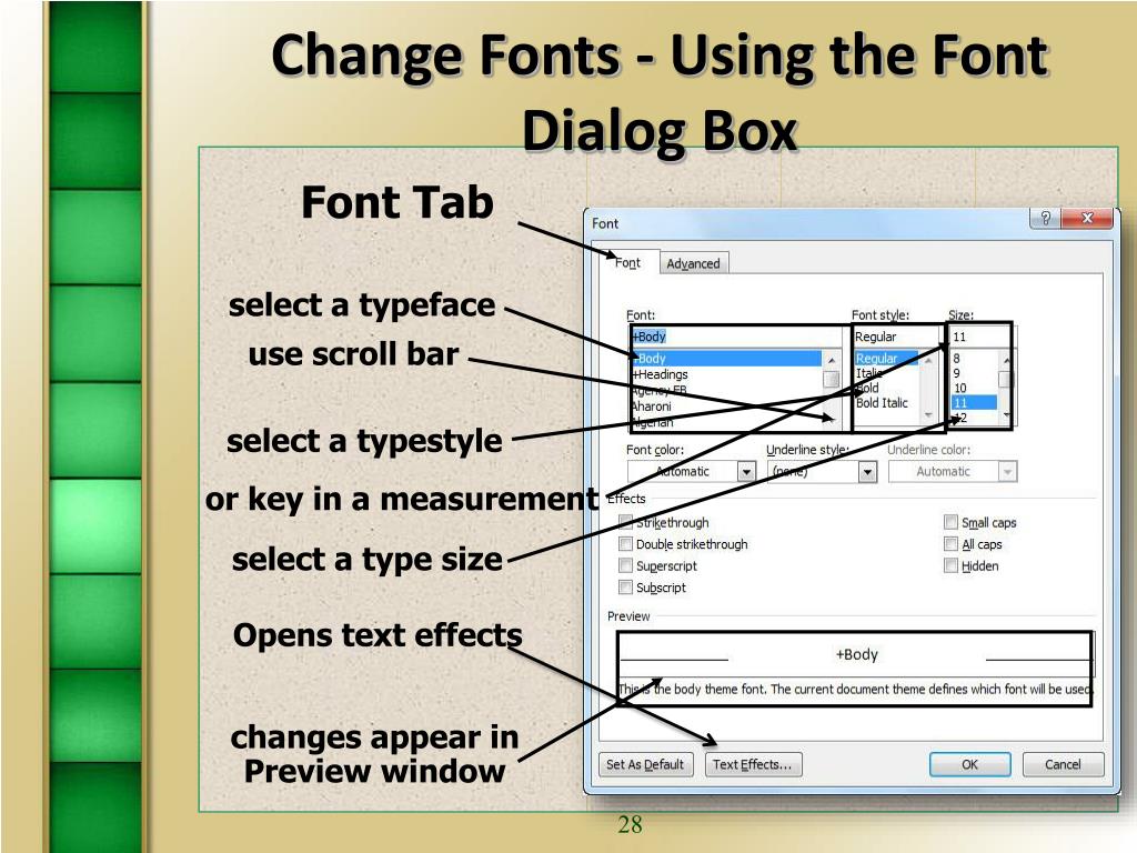 Change Fonts - Using the Font Dialog Box Font Tab select a typeface use scroll bar select a typestyle or key in a measurement select a type size Opens text effects changes appear inPreview window