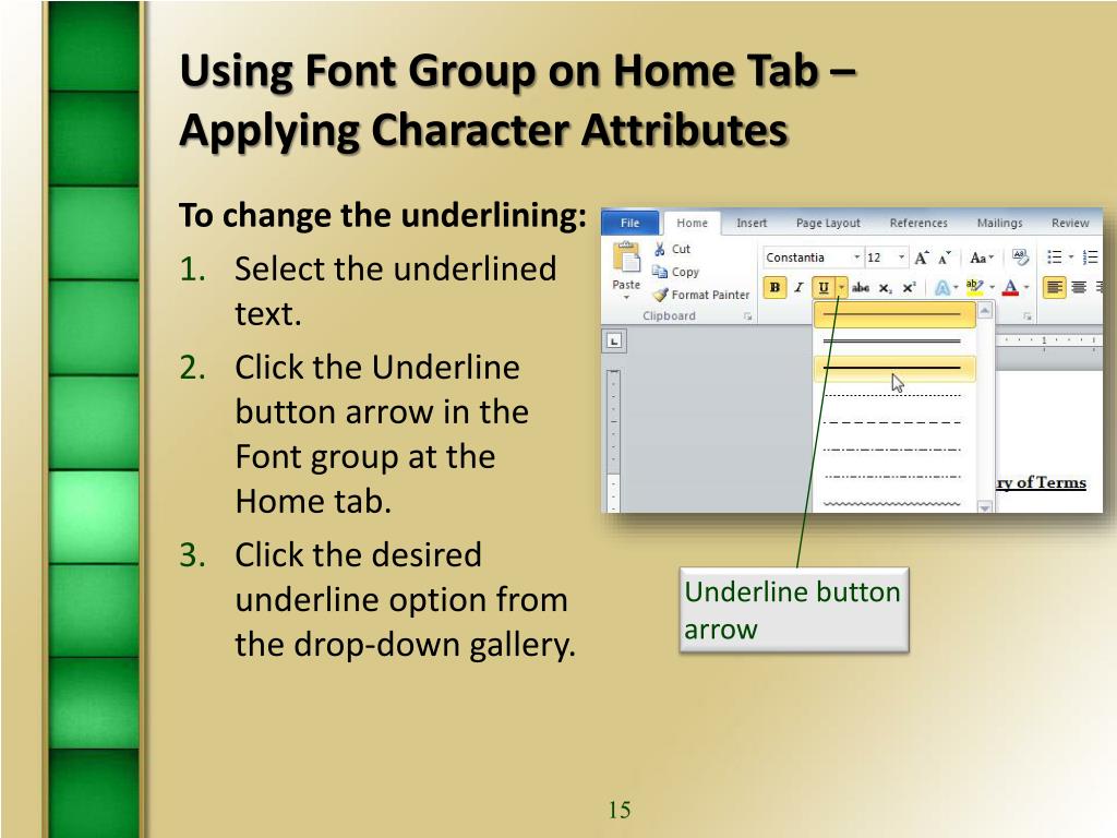 Using Font Group on Home Tab – Applying Character Attributes To change the underlining: • Select the underlined text. • Click the Underline button arrow in the Font group at the Home tab. • Click the desired underline option from the drop-down gallery. Underline button arrow
