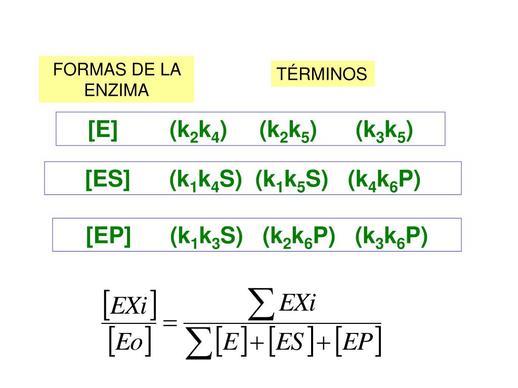 FORMAS DE LA ENZIMA TÉRMINOS [E] (k2k4) (k2k5) (k3k5) [ES] (k1k4S) (k1k5S) (k4k6P) [EP] (k1k3S) (k2k6P) (k3k6P)