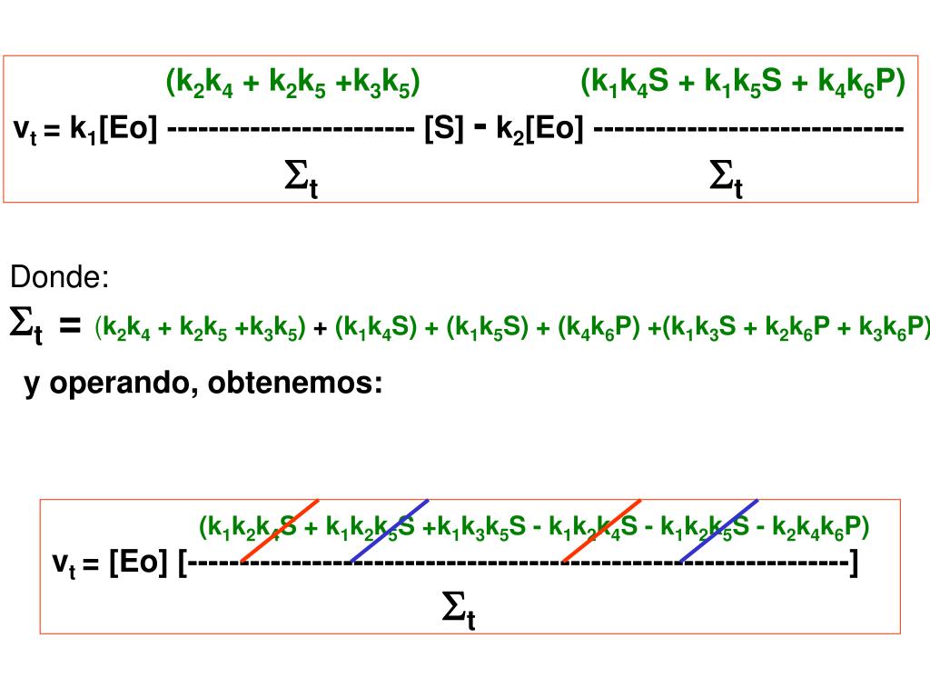 (k2k4 + k2k5 +k3k5) (k1k4S + k1k5S + k4k6P) vt = k1[Eo] ------------------------ [S] - k2[Eo] ------------------------------ t t Donde: t = (k2k4 + k2k5 +k3k5) + (k1k4S) + (k1k5S) + (k4k6P) +(k1k3S + k2k6P + k3k6P) y operando, obtenemos: (k1k2k4S + k1k2k5S +k1k3k5S - k1k2k4S - k1k2k5S - k2k4k6P)vt = [Eo] [----------------------------------------------------------------] t