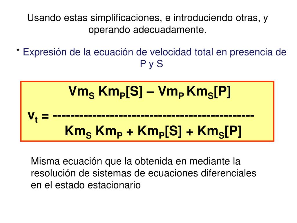 Usando estas simplificaciones, e introduciendo otras, y operando adecuadamente. * Expresión de la ecuación de velocidad total en presencia de P y S VmS KmP[S] – VmP KmS[P] vt = ---------------------------------------------- KmS KmP + KmP[S] + KmS[P] Misma ecuación que la obtenida en mediante la resolución de sistemas de ecuaciones diferenciales en el estado estacionario