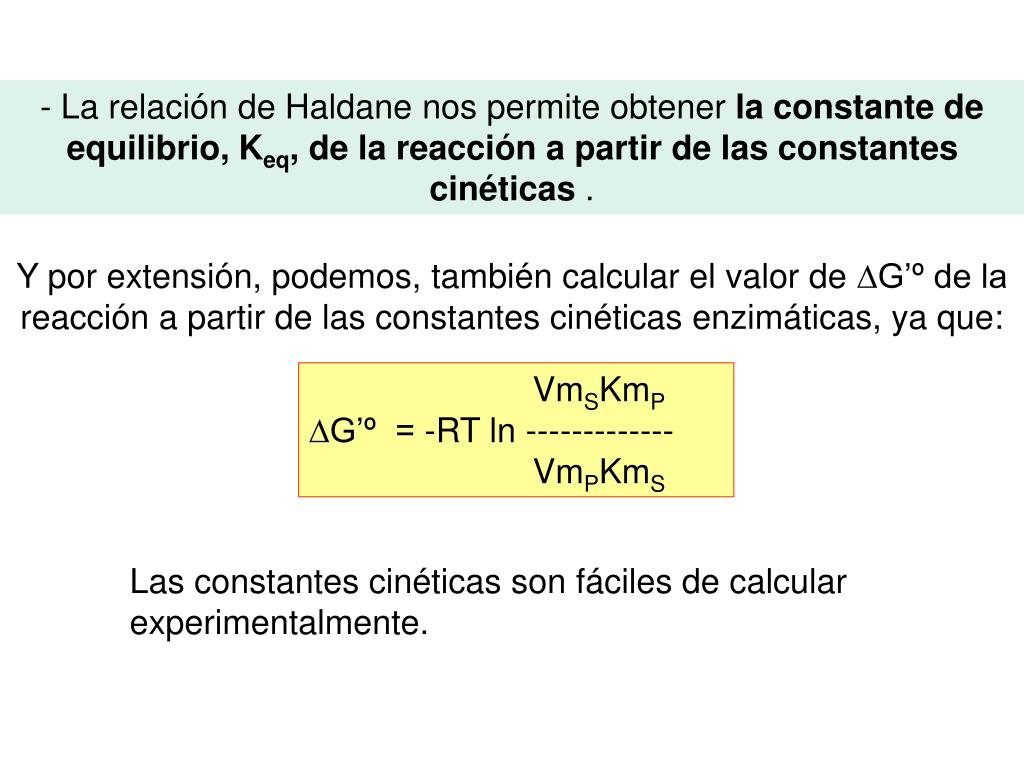 - La relación de Haldane nos permite obtener la constante de equilibrio, Keq, de la reacción a partir de las constantes cinéticas . Y por extensión, podemos, también calcular el valor de G’º de la reacción a partir de las constantes cinéticas enzimáticas, ya que: VmSKmPG’º = -RT ln ------------- VmPKmS Las constantes cinéticas son fáciles de calcular experimentalmente.