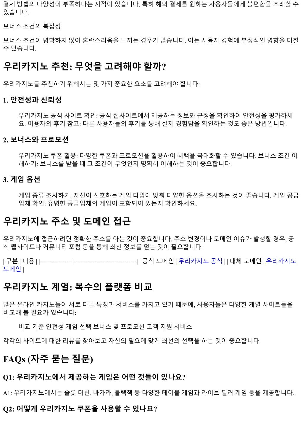 결제방법의다양성이부족하다는지적이있습니다. 특히해외결제를원하는사용자들에게불편함을초래할수 있습니다. 보너스조건의복잡성 보너스조건이명확하지않아혼란스러움을느끼는경우가많습니다. 이는사용자경험에부정적인영향을미칠 수있습니다. 우리카지노추천: 무엇을고려해야할까? 우리카지노를추천하기위해서는몇가지중요한요소를고려해야합니다: 1. 안전성과신뢰성 우리카지노공식사이트확인: 공식웹사이트에서제공하는정보와규정을확인하여안전성을평가하세 요. 이용자의후기참고: 다른사용자들의후기를통해실제경험담을확인하는것도좋은방법입니다. 2. 보너스와프로모션 우리카지노쿠폰활용: 다양한쿠폰과프로모션을활용하여혜택을극대화할수있습니다. 보너스조건이 해하기: 보너스를받을때그조건이무엇인지명확히이해하는것이중요합니다. 3. 게임옵션 게임종류조사하기: 자신이선호하는게임타입에맞춰다양한옵션을조사하는것이좋습니다. 게임공급 업체확인: 유명한공급업체의게임이포함되어있는지확인하세요. 우리카지노주소및도메인접근 우리카지노에접근하려면정확한주소를아는것이중요합니다. 주소변경이나도메인이슈가발생할경우, 공 식웹사이트나커뮤니티포럼등을통해최신정보를얻는것이필요합니다. | 구분 | 내용 | |----------------|-------------------------------| | 공식도메인 | 우리카지노공식 | | 대체도메인 | 우리카지노 도메인 | 우리카지노계열: 복수의플랫폼비교 많은온라인카지노들이서로다른특징과서비스를가지고있기때문에, 사용자들은다양한계열사이트들을 비교해볼필요가있습니다: 비교기준안전성게임선택보너스및프로모션고객지원서비스 각각의사이트에대한리뷰를찾아보고자신의필요에맞게최선의선택을하는것이중요합니다. FAQs (자주묻는질문) Q1: 우리카지노에서제공하는게임은어떤것들이있나요? A1: 우리카지노에서는슬롯머신, 바카라, 블랙잭등다양한테이블게임과라이브딜러게임등을제공합니다. Q2: 어떻게우리카지노쿠폰을사용할수있나요?
