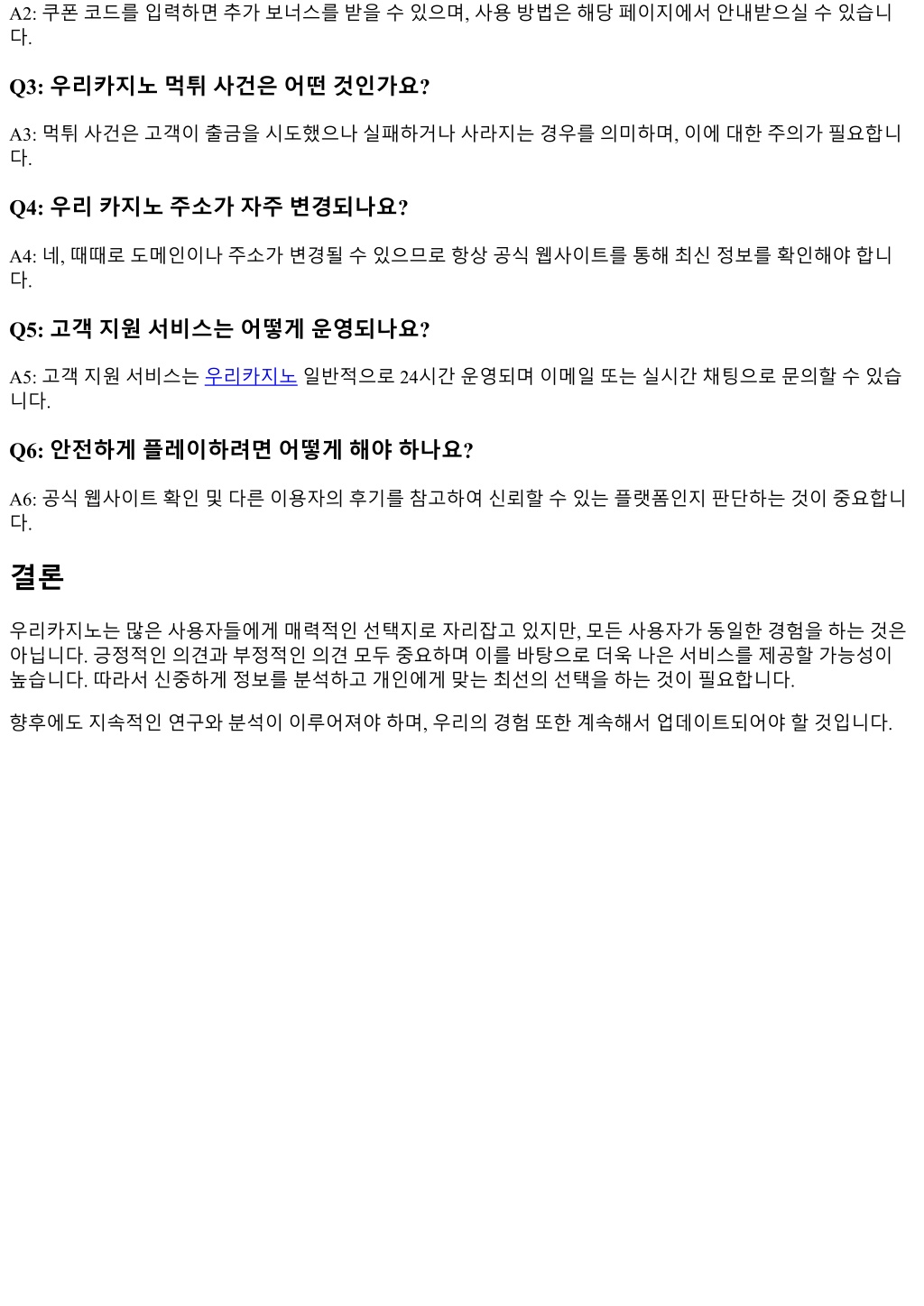 A2: 쿠폰코드를입력하면추가보너스를받을수있으며, 사용방법은해당페이지에서안내받으실수있습니 다. Q3: 우리카지노먹튀사건은어떤것인가요? A3: 먹튀사건은고객이출금을시도했으나실패하거나사라지는경우를의미하며, 이에대한주의가필요합니 다. Q4: 우리카지노주소가자주변경되나요? A4: 네, 때때로도메인이나주소가변경될수있으므로항상공식웹사이트를통해최신정보를확인해야합니 다. Q5: 고객지원서비스는어떻게운영되나요? A5: 고객지원서비스는우리카지노일반적으로 24시간운영되며이메일또는실시간채팅으로문의할수있습 니다. Q6: 안전하게플레이하려면어떻게해야하나요? A6: 공식웹사이트확인및다른이용자의후기를참고하여신뢰할수있는플랫폼인지판단하는것이중요합니 다. 결론 우리카지노는많은사용자들에게매력적인선택지로자리잡고있지만, 모든사용자가동일한경험을하는것은 아닙니다. 긍정적인의견과부정적인의견모두중요하며이를바탕으로더욱나은서비스를제공할가능성이 높습니다. 따라서신중하게정보를분석하고개인에게맞는최선의선택을하는것이필요합니다. 향후에도지속적인연구와분석이이루어져야하며, 우리의경험또한계속해서업데이트되어야할것입니다.