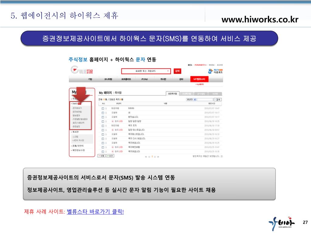 5. 웹에이전시의 하이웍스 제휴 증권정보제공사이트에서 하이웍스 문자(SMS)를 연동하여 서비스 제공 주식정보 홈페이지 + 하이웍스 문자연동 증권정보제공사이트의 서비스로서 문자(SMS) 발송 시스템 연동 정보제공사이트, 영업관리솔루션 등 실시간 문자 알림 기능이 필요한 사이트 채용 제휴 사례 사이트: 벨류스타 바로가기 클릭! 27