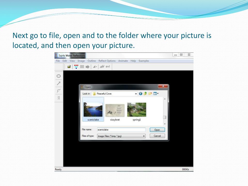 Next go to file, open and to the folder where your picture is located, and then open your picture.