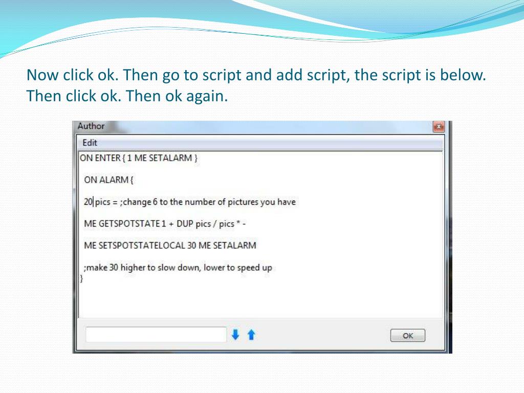 Now click ok. Then go to script and add script, the script is below. Then click ok. Then ok again.
