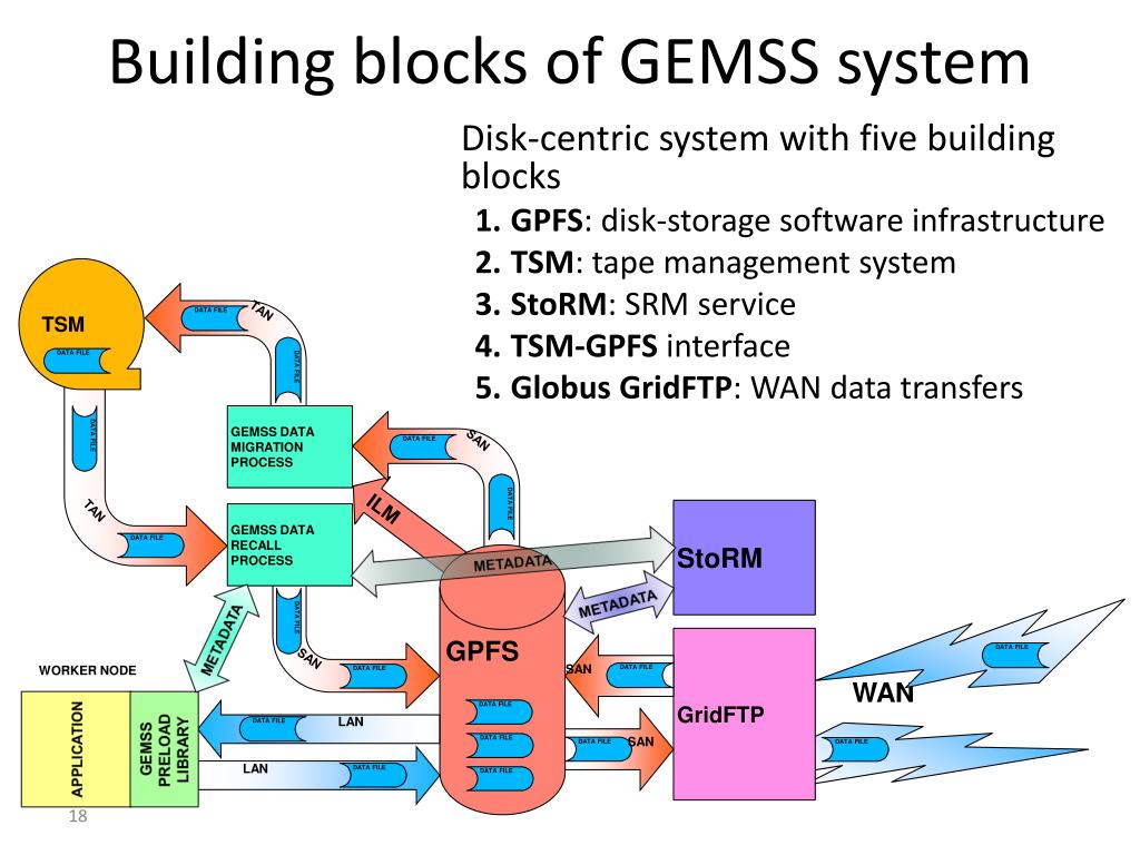 DATA FILE DATA FILE DATA FILE DATA FILE DATA FILE DATA FILE DATA FILE DATA FILE DATA FILE DATA FILE DATA FILE DATA FILE DATA FILE DATA FILE DATA FILE DATA FILE DATA FILE DATA FILE GEMSS DATA MIGRATIONPROCESS GEMSS DATA RECALLPROCESS ILM StoRM TSM TAN GridFTP GPFS SAN TAN SAN SAN WORKER NODE WAN LAN SAN LAN Building blocks of GEMSS system Disk-centric system with five building blocks • GPFS: disk-storage software infrastructure • TSM: tape management system • StoRM: SRM service • TSM-GPFS interface • GlobusGridFTP: WAN data transfers