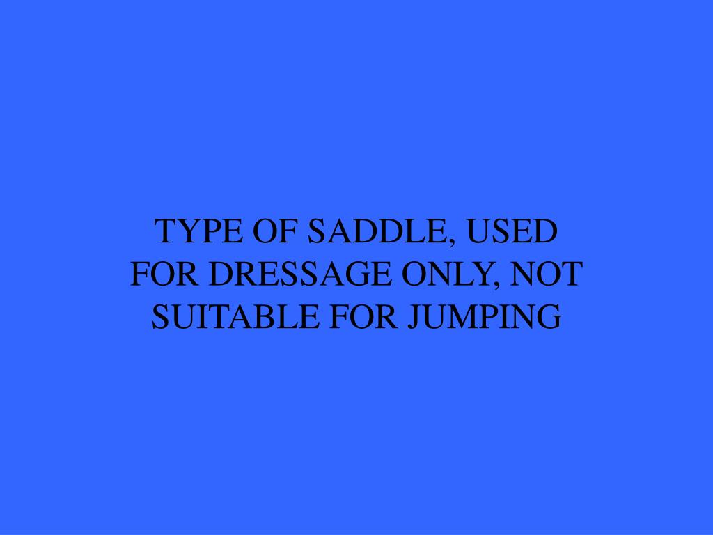 TYPE OF SADDLE, USED FOR DRESSAGE ONLY, NOT SUITABLE FOR JUMPING