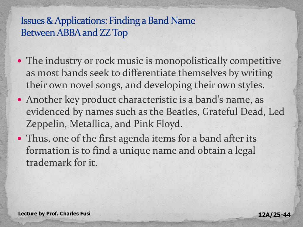 Issues & Applications: Finding a Band NameBetween ABBA and ZZ Top The industry or rock music is monopolistically competitive as most bands seek to differentiate themselves by writing their own novel songs, and developing their own styles. Another key product characteristic is a band’s name, as evidenced by names such as the Beatles, Grateful Dead, Led Zeppelin, Metallica, and Pink Floyd. Thus, one of the first agenda items for a band after its formation is to find a unique name and obtain a legal trademark for it. Lecture by Prof. Charles Fusi