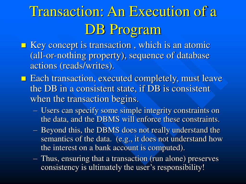 Transaction: An Execution of a DB Program • Key concept is transaction , which is an atomic (all-or-nothing property), sequence of database actions (reads/writes). • Each transaction, executed completely, mustleave the DB in a consistent state, if DB isconsistent when the transaction begins. • Users can specify some simple integrity constraints on the data, and the DBMS will enforce these constraints. • Beyond this, the DBMS does not really understand thesemantics of the data. (e.g., it does not understandhow the interest on a bank account is computed). • Thus, ensuring that a transaction (run alone) preservesconsistency is ultimately the user’s responsibility!