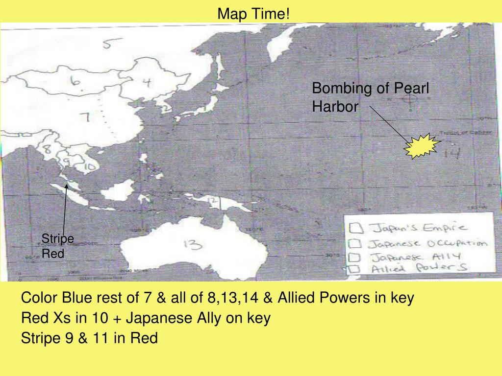 Map Time! Bombing of Pearl Harbor Color Blue rest of 7 & all of 8,13,14 & Allied Powers in key Red Xs in 10 + Japanese Ally on key Stripe 9 & 11 in Red Stripe Red