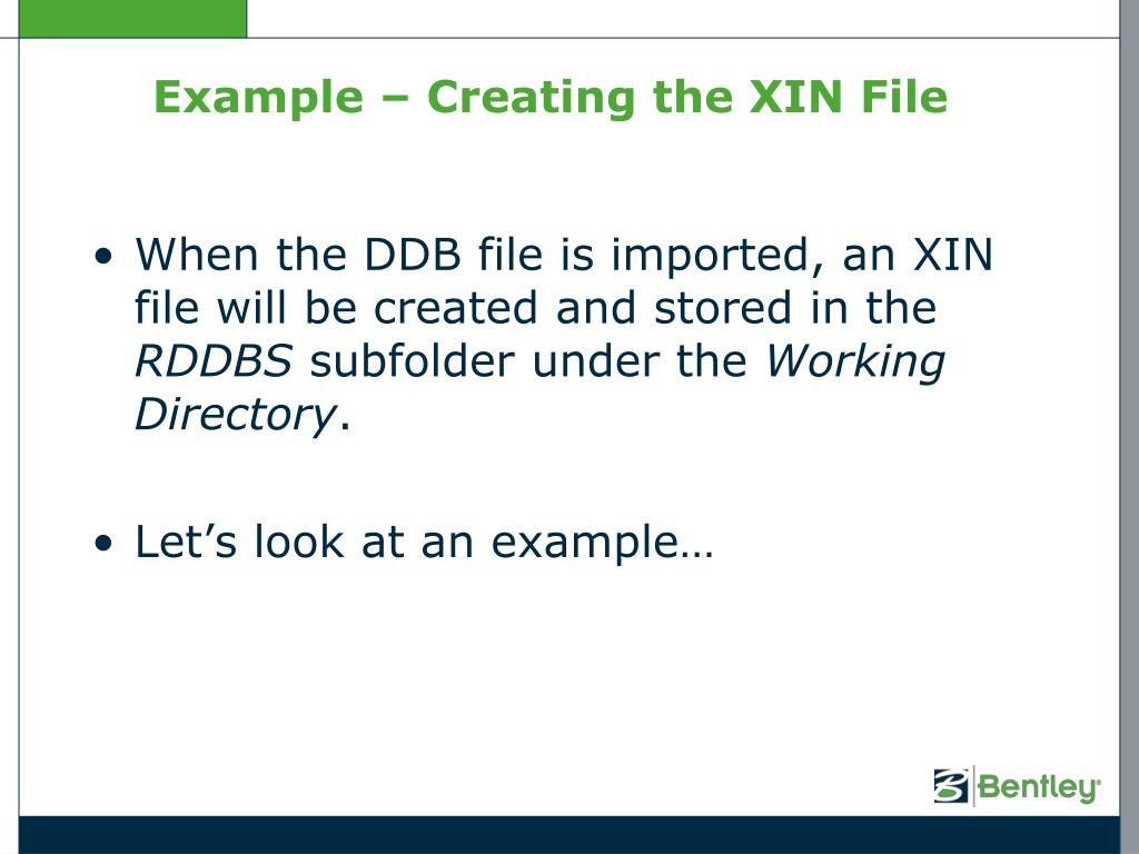 Example – Creating the XIN File • When the DDB file is imported, an XIN file will be created and stored in the RDDBS subfolder under the Working Directory. • Let’s look at an example…