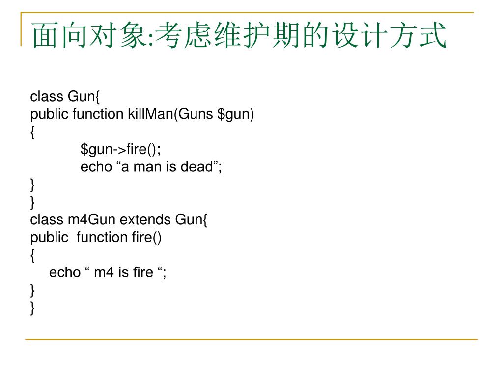 面向对象:考虑维护期的设计方式 class Gun{ public function killMan(Guns $gun) { $gun->fire(); echo “a man is dead”; } } class m4Gun extends Gun{ public function fire() { echo “ m4 is fire “; } }