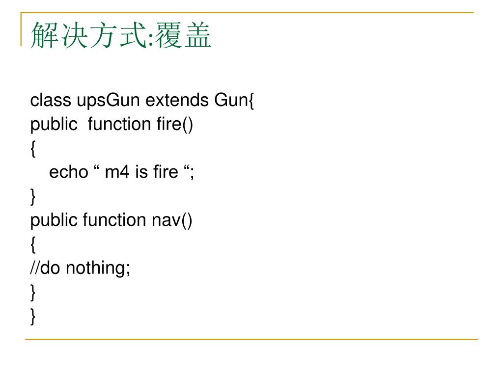 解决方式:覆盖 class upsGun extends Gun{ public function fire() { echo “ m4 is fire “; } public function nav() { //do nothing; } }