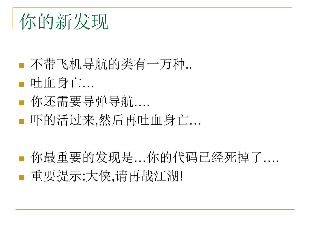 你的新发现 • 不带飞机导航的类有一万种.. • 吐血身亡… • 你还需要导弹导航…. • 吓的活过来,然后再吐血身亡… • 你最重要的发现是…你的代码已经死掉了…. • 重要提示:大侠,请再战江湖!
