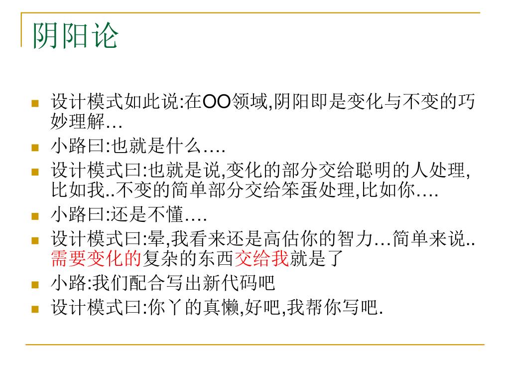 阴阳论 • 设计模式如此说:在OO领域,阴阳即是变化与不变的巧妙理解… • 小路曰:也就是什么…. • 设计模式曰:也就是说,变化的部分交给聪明的人处理,比如我..不变的简单部分交给笨蛋处理,比如你…. • 小路曰:还是不懂…. • 设计模式曰:晕,我看来还是高估你的智力…简单来说..需要变化的复杂的东西交给我就是了 • 小路:我们配合写出新代码吧 • 设计模式曰:你丫的真懒,好吧,我帮你写吧.
