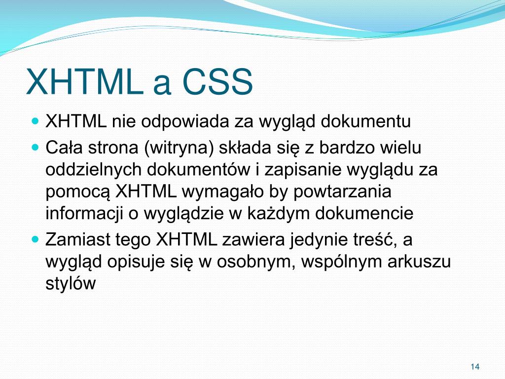 XHTML a CSS • XHTML nie odpowiada za wygląd dokumentu • Cała strona (witryna) składa się z bardzo wielu oddzielnych dokumentów i zapisanie wyglądu za pomocą XHTML wymagało by powtarzania informacji o wyglądzie w każdym dokumencie • Zamiast tego XHTML zawiera jedynie treść, a wygląd opisuje się w osobnym, wspólnym arkuszu stylów