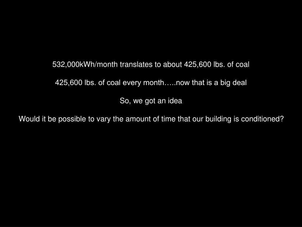 532,000kWh/month translates to about 425,600 lbs. of coal 425,600 lbs. of coal every month…..now that is a big deal So, we got an idea Would it be possible to vary the amount of time that our building is conditioned?