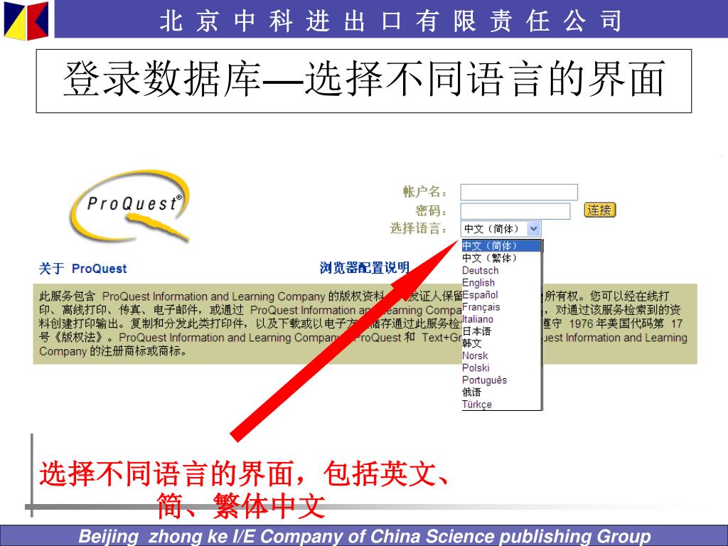 北京中科进出口有限责任公司. 学位论文提交说明. 2007 年 8 月 16 日. 学位论文提交操作流程. 选择待提交论文. 进入 http://proquest.umi.com/login 文摘库. 检索并选择待提交论文. 发送并保存已选择的待提交论文. 数据格式转换. 下载格式转换工具. 转换待提交论文格式. 查重并提交论文. 数据查重. 提交论文订单. 登录数据库 — 选择不同语言的界面. 选择不同语言的界面,包括英文、简、繁体中文. 用户名和密码 — 有效的 IP 段内. IPAUTO. 在有效的 IP 段内,登陆的用户名和密码是 IPAUTO.