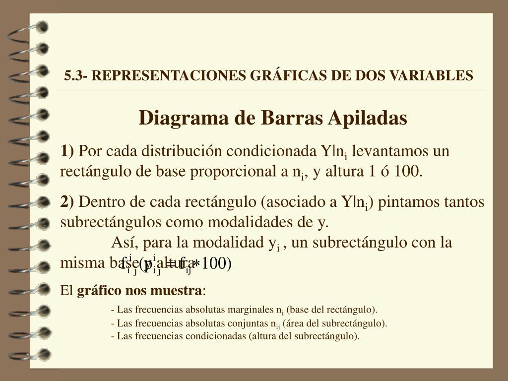 Diagrama de Barras Apiladas 1) Por cada distribución condicionada Y|ni levantamos un rectángulo de base proporcional a ni, y altura 1 ó 100. 2) Dentro de cada rectángulo (asociado a Y|ni) pintamos tantos subrectángulos como modalidades de y. Así, para la modalidad yi , un subrectángulo con la misma base y altura El gráfico nos muestra: - Las frecuencias absolutas marginales ni (base del rectángulo). - Las frecuencias absolutas conjuntas nij (área del subrectángulo). - Las frecuencias condicionadas (altura del subrectángulo). 5.3- REPRESENTACIONES GRÁFICAS DE DOS VARIABLES