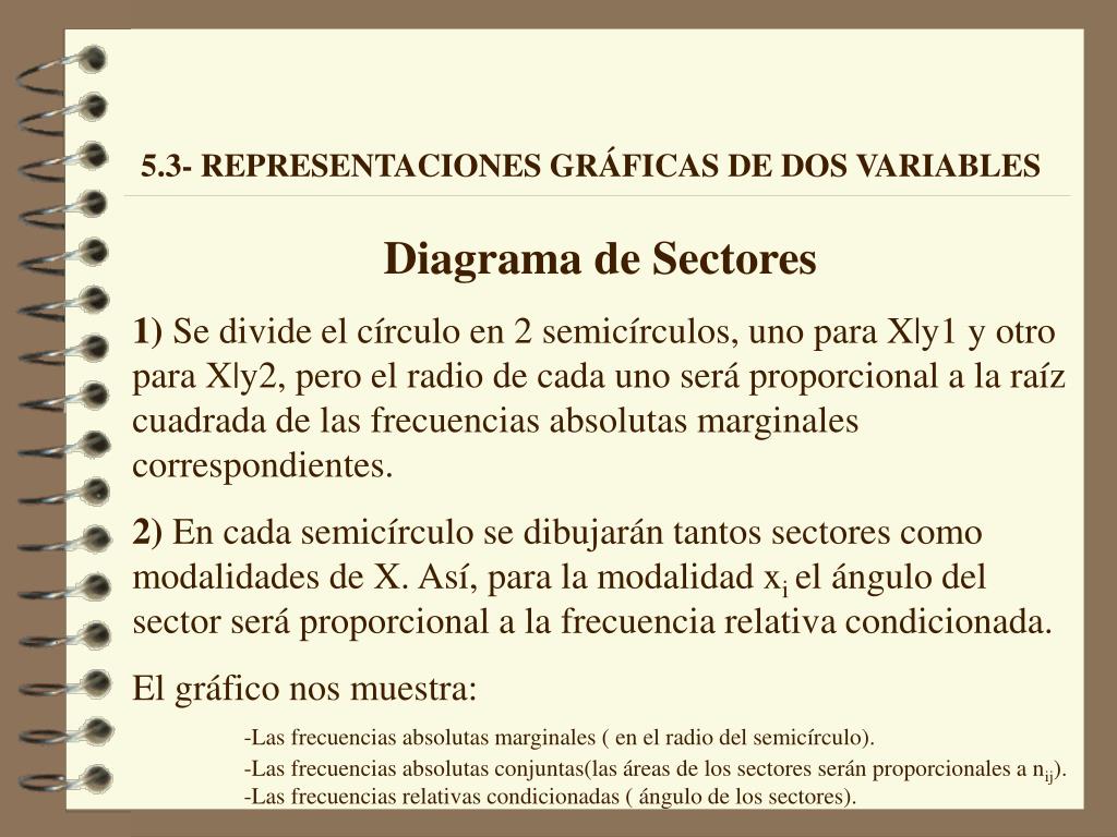 5.3- REPRESENTACIONES GRÁFICAS DE DOS VARIABLES Diagrama de Sectores 1) Se divide el círculo en 2 semicírculos, uno para X|y1 y otro para X|y2, pero el radio de cada uno será proporcional a la raíz cuadrada de las frecuencias absolutas marginales correspondientes. 2) En cada semicírculo se dibujarán tantos sectores como modalidades de X. Así, para la modalidad xi el ángulo del sector será proporcional a la frecuencia relativa condicionada. El gráfico nos muestra: -Las frecuencias absolutas marginales ( en el radio del semicírculo). -Las frecuencias absolutas conjuntas(las áreas de los sectores serán proporcionales a nij). -Las frecuencias relativas condicionadas ( ángulo de los sectores).