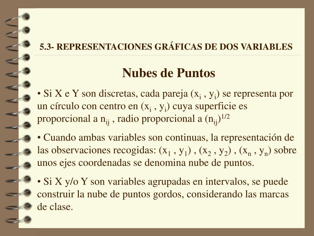 5.3- REPRESENTACIONES GRÁFICAS DE DOS VARIABLES • Nubes de Puntos • Si X e Y son discretas, cada pareja (xi , yi) se representa por un círculo con centro en (xi , yi) cuya superficie es proporcional a nij , radio proporcional a (nij)1/2 • Cuando ambas variables son continuas, la representación de las observaciones recogidas: (x1 , y1) , (x2 , y2) , (xn , yn) sobre unos ejes coordenadas se denomina nube de puntos. • Si X y/o Y son variables agrupadas en intervalos, se puede construir la nube de puntos gordos, considerando las marcas de clase.