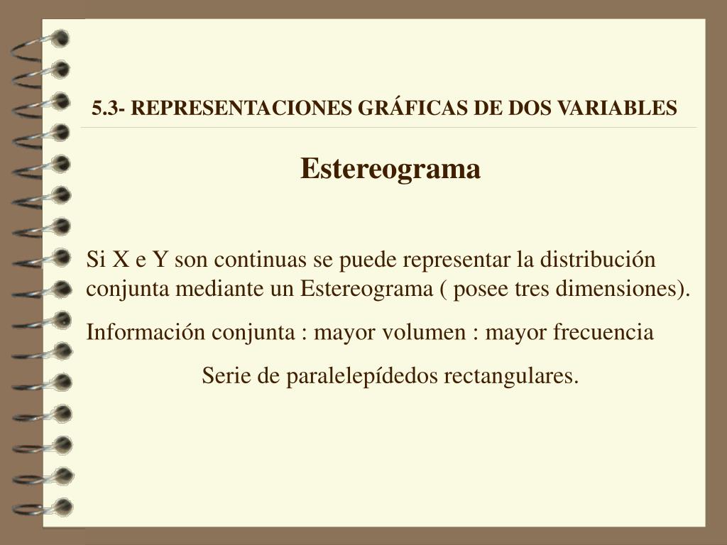 5.3- REPRESENTACIONES GRÁFICAS DE DOS VARIABLES Estereograma Si X e Y son continuas se puede representar la distribución conjunta mediante un Estereograma ( posee tres dimensiones). Información conjunta : mayor volumen : mayor frecuencia Serie de paralelepídedos rectangulares.
