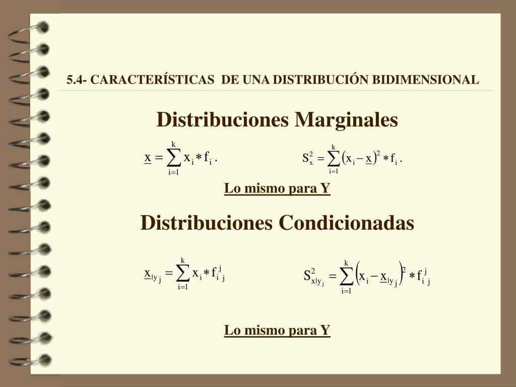 Distribuciones Marginales Lo mismo para Y Distribuciones Condicionadas Lo mismo para Y 5.4- CARACTERÍSTICAS DE UNA DISTRIBUCIÓN BIDIMENSIONAL