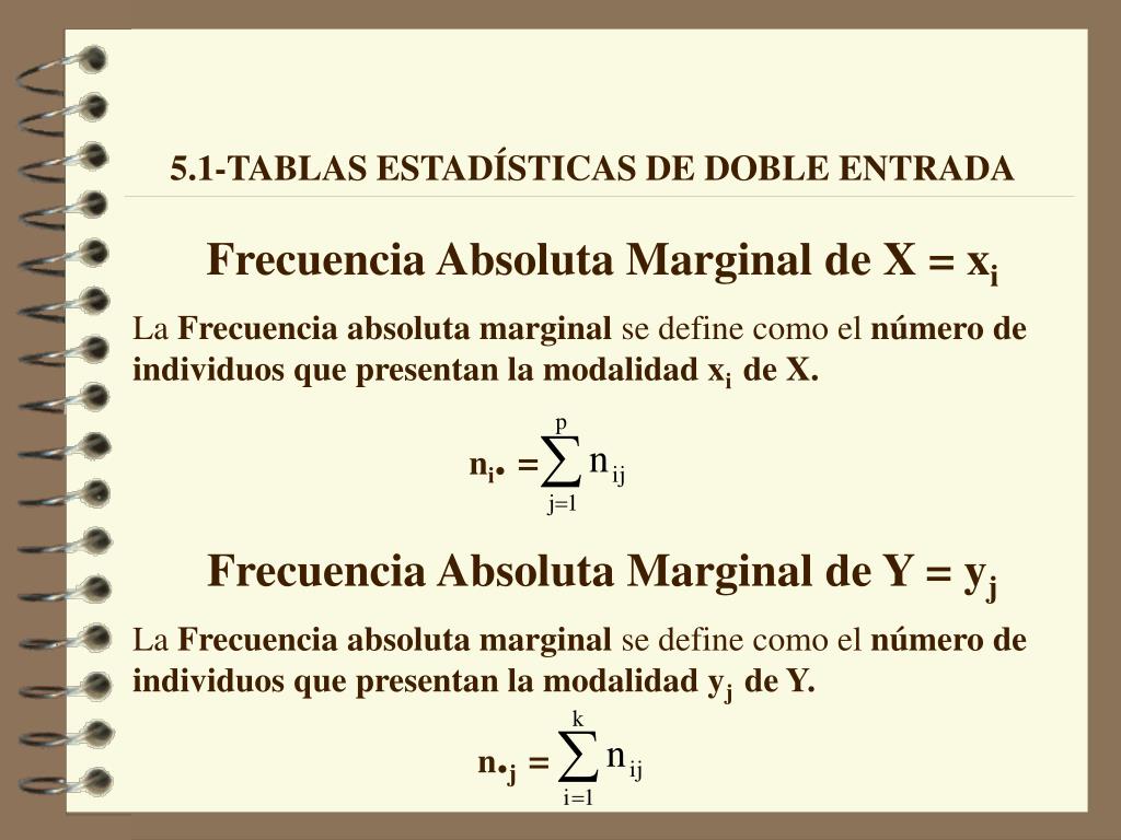 Frecuencia Absoluta Marginal de X = xi La Frecuencia absoluta marginal se define como el número de individuos que presentan la modalidad xi de X. ni. = Frecuencia Absoluta Marginal de Y = yj La Frecuencia absoluta marginal se define como el número de individuos que presentan la modalidad yj de Y. n.j= 5.1-TABLAS ESTADÍSTICAS DE DOBLE ENTRADA