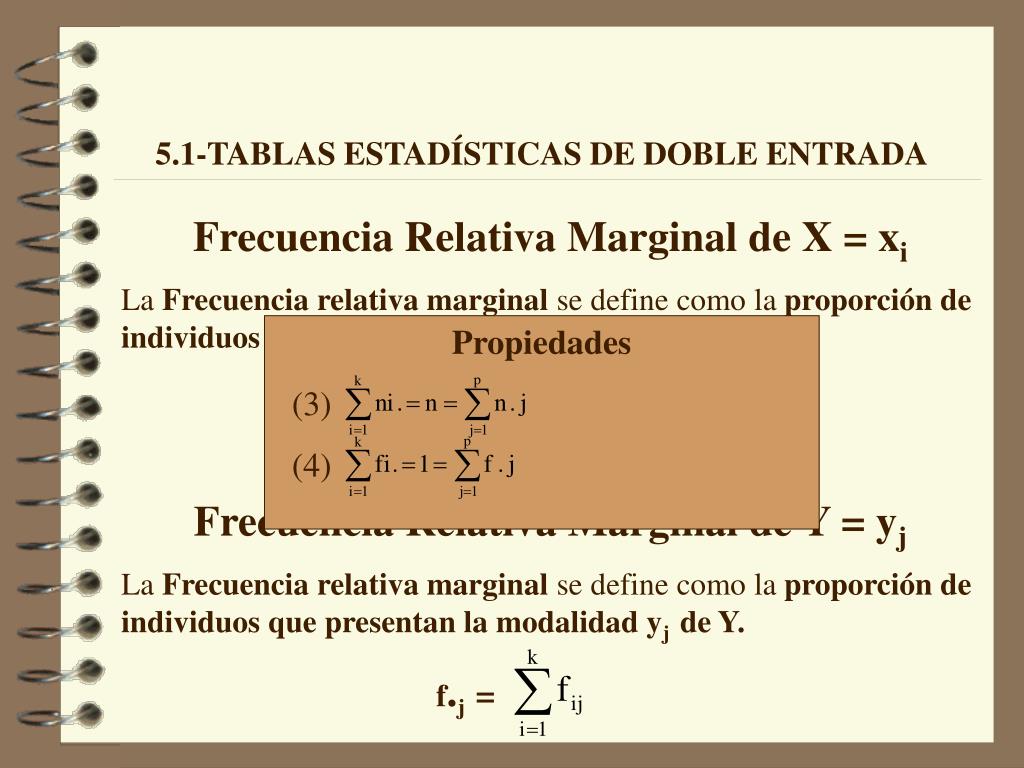 Frecuencia Relativa Marginal de X = xi La Frecuencia relativa marginal se define como la proporción de individuos que presentan la modalidad xi de X. fi. = Frecuencia Relativa Marginal de Y = yj La Frecuencia relativa marginal se define como la proporción de individuos que presentan la modalidad yj de Y. f.j= Propiedades (3) (4) 5.1-TABLAS ESTADÍSTICAS DE DOBLE ENTRADA