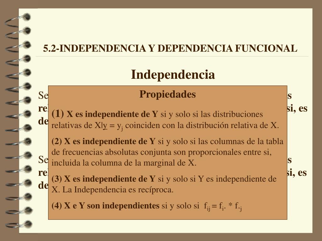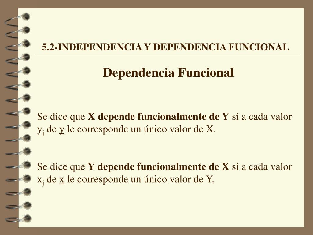 5.2-INDEPENDENCIA Y DEPENDENCIA FUNCIONAL Dependencia Funcional Se dice que X depende funcionalmente de Y si a cada valor yj de y le corresponde un único valor de X. Se dice que Y depende funcionalmente de X si a cada valor xj de x le corresponde un único valor de Y.