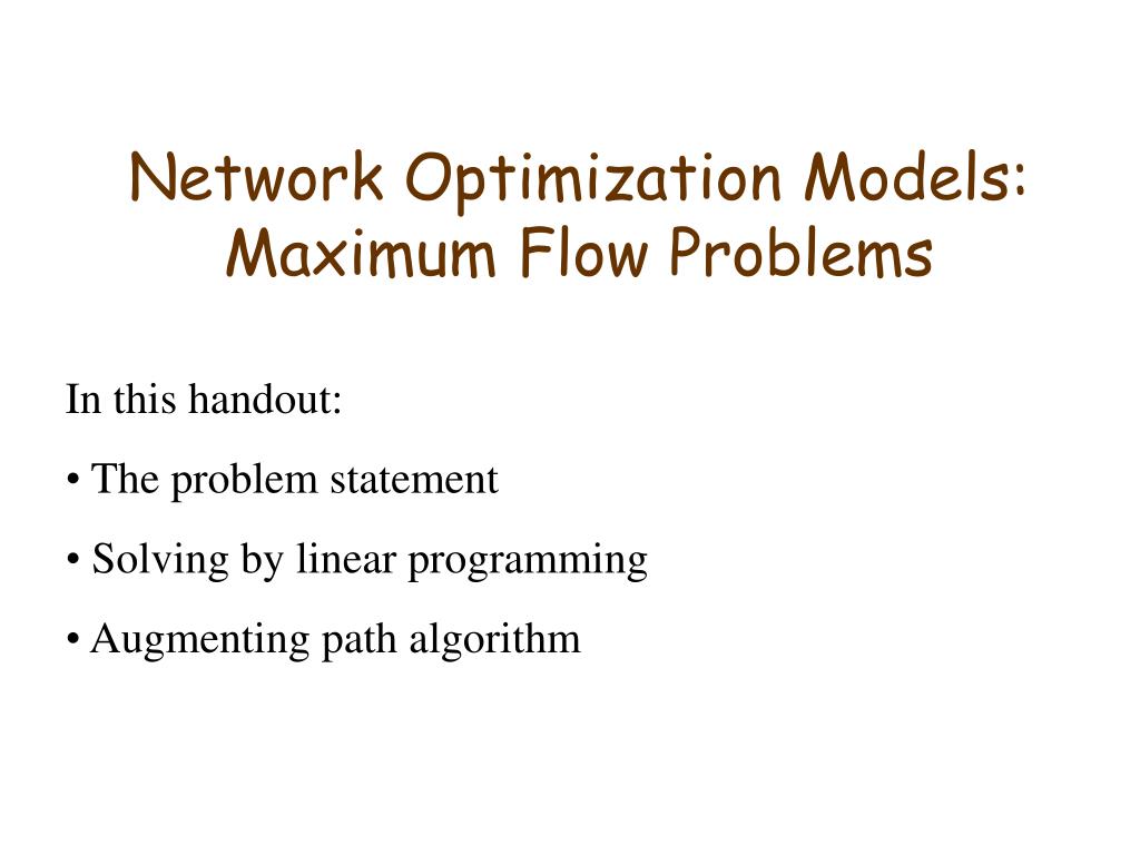 Network Optimization Models:Maximum Flow Problems • In this handout: • The problem statement • Solving by linear programming • Augmenting path algorithm