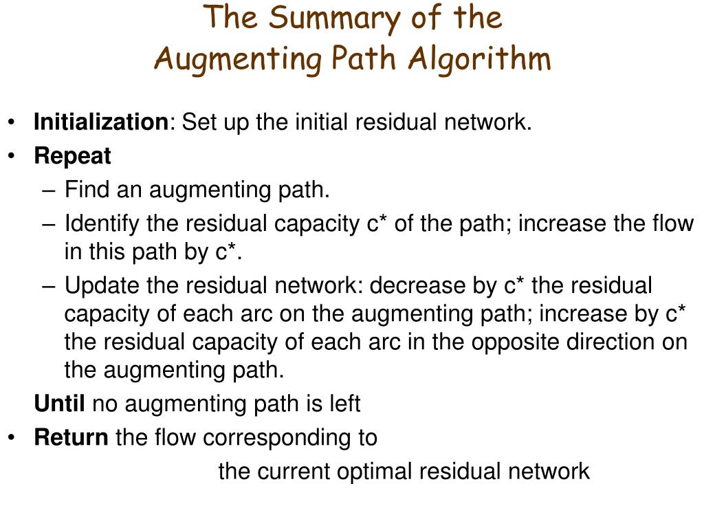 The Summary of the Augmenting Path Algorithm • Initialization: Set up the initial residual network. • Repeat • Find an augmenting path. • Identify the residual capacity c* of the path; increase the flow in this path by c*. • Update the residual network: decrease by c* the residual capacity of each arc on the augmenting path; increase by c* the residual capacity of each arc in the opposite direction on the augmenting path. Until no augmenting path is left • Return the flow corresponding to the current optimal residual network