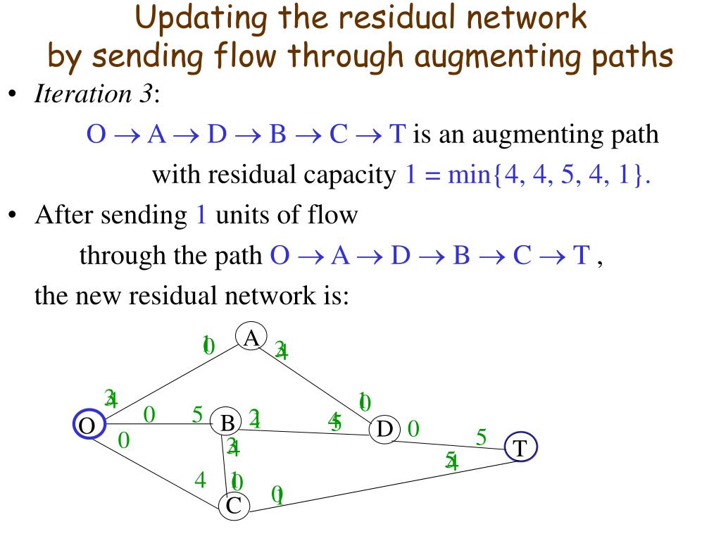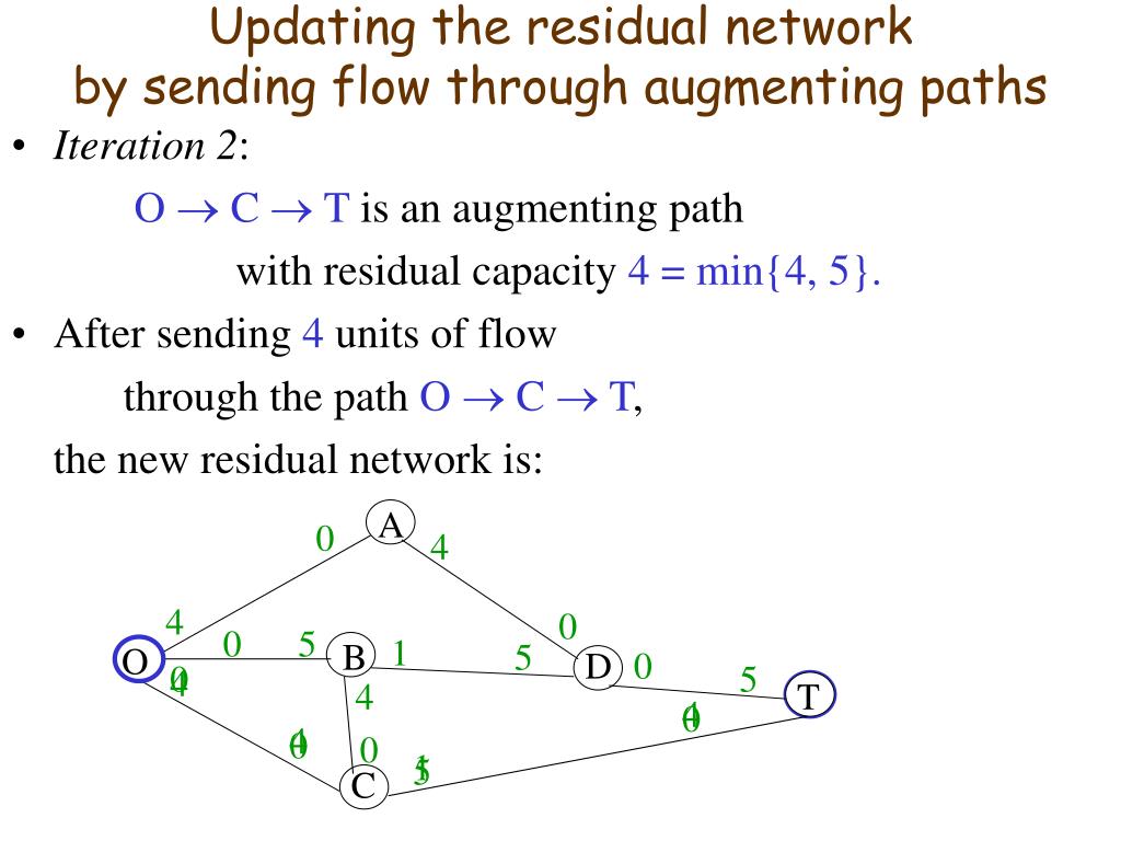 0 A 4 4 1 B O D 4 T 0 0 5 C Updating the residual network by sending flow through augmenting paths • Iteration 2: O C T is an augmenting path with residual capacity 4 = min{4, 5}. • After sending 4 units of flow through the path O C T, the new residual network is: 0 4 4 0 0 5 1 5 0 5 4 0