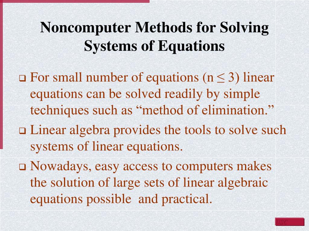 Noncomputer Methods for Solving Systems of Equations • For small number of equations (n ≤ 3) linear equations can be solved readily by simple techniques such as “method of elimination.” • Linear algebra provides the tools to solve such systems of linear equations. • Nowadays, easy access to computers makes the solution of large sets of linear algebraic equations possible and practical.