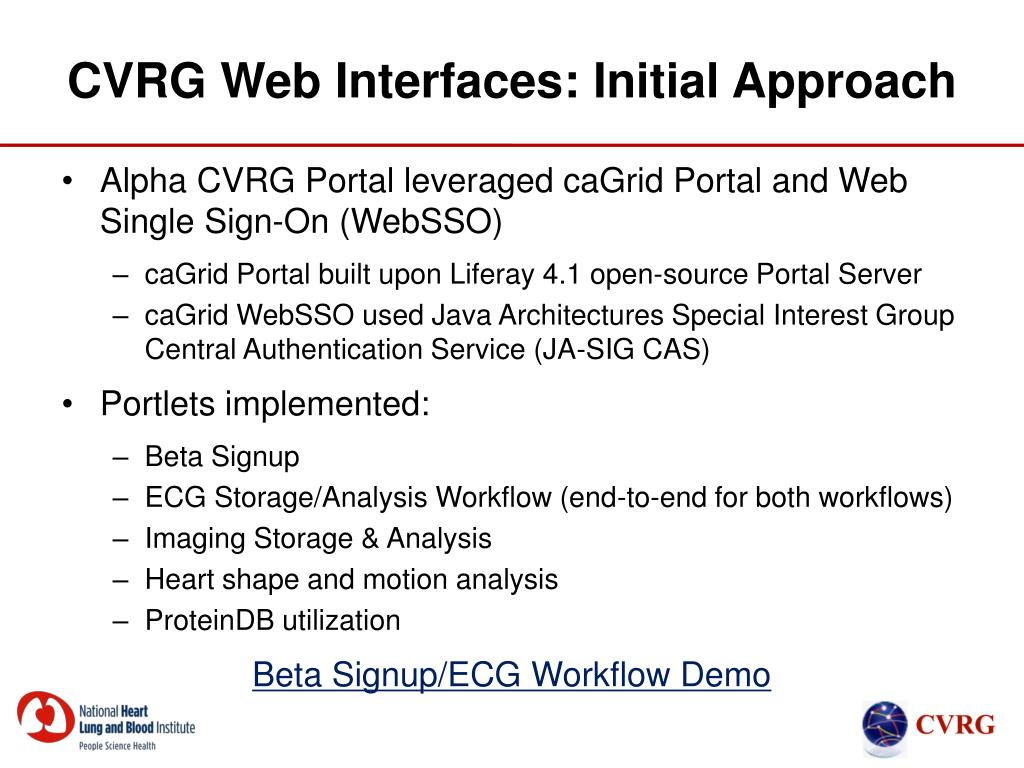 CVRG Web Interfaces: Initial Approach • Alpha CVRG Portal leveraged caGrid Portal and Web Single Sign-On (WebSSO) • caGrid Portal built upon Liferay 4.1 open-source Portal Server • caGridWebSSO used Java Architectures Special Interest Group Central Authentication Service (JA-SIG CAS) • Portlets implemented: • Beta Signup • ECG Storage/Analysis Workflow (end-to-end for both workflows) • Imaging Storage & Analysis • Heart shape and motion analysis • ProteinDB utilization Beta Signup/ECG Workflow Demo