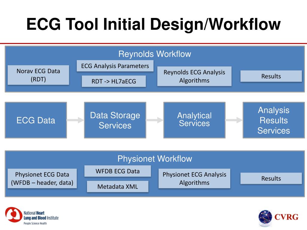 ECG Tool Initial Design/Workflow Reynolds Workflow ECG Analysis Parameters Norav ECG Data (RDT) Reynolds ECG Analysis Algorithms Results RDT -> HL7aECG ECG Data Data Storage Services Analytical Services Analysis Results Services Physionet Workflow WFDB ECG Data Physionet ECG Data (WFDB – header, data) Physionet ECG Analysis Algorithms Results Metadata XML