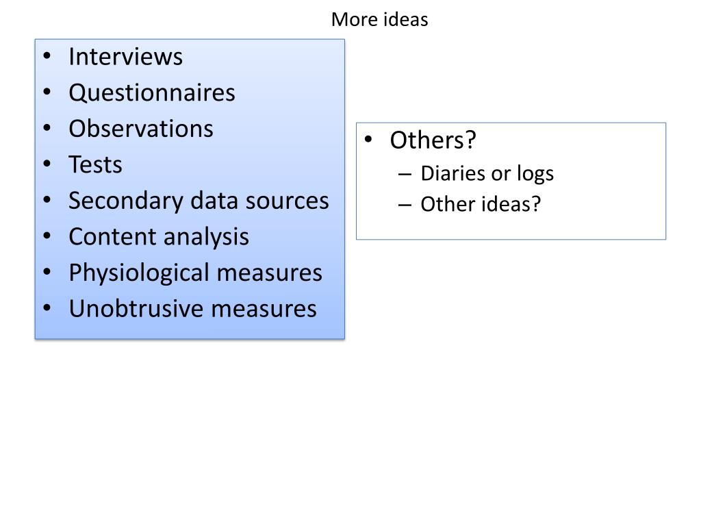 More ideas • Interviews • Questionnaires • Observations • Tests • Secondary data sources • Content analysis • Physiological measures • Unobtrusive measures • Others? • Diaries or logs • Other ideas?