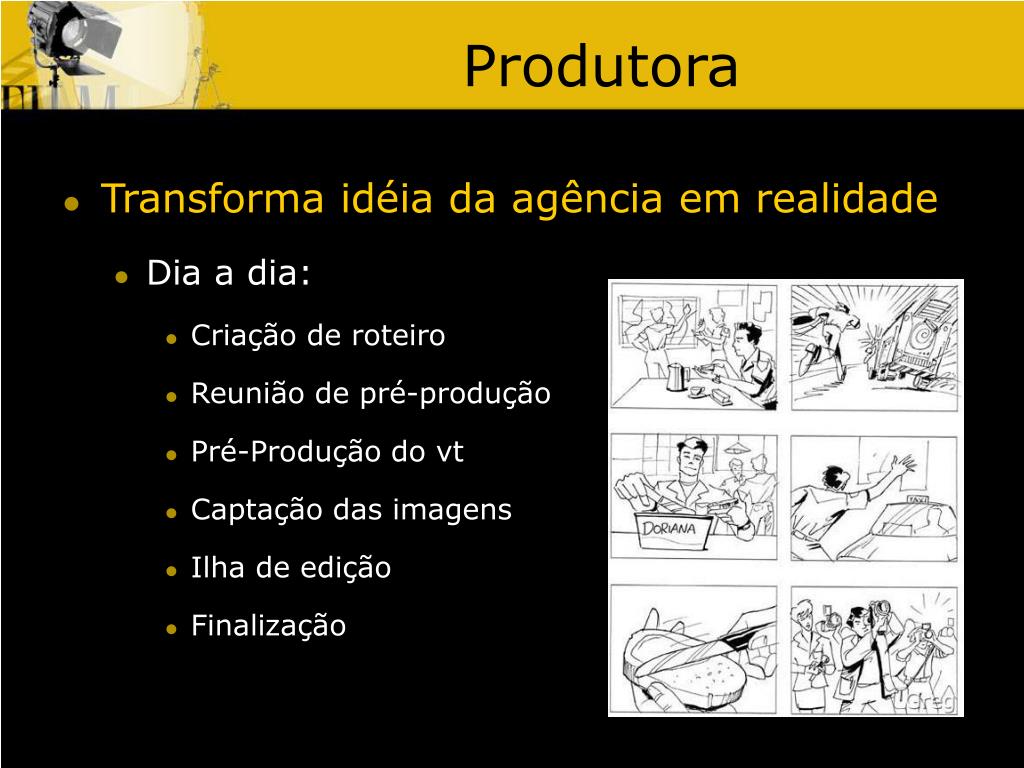 Produtora • Transforma idéia da agência em realidade • Dia a dia: • Criação de roteiro • Reunião de pré-produção • Pré-Produção do vt • Captação das imagens • Ilha de edição • Finalização