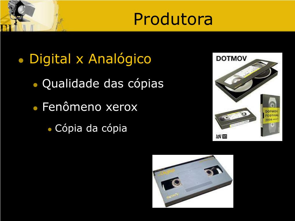 Produtora • Digital x Analógico • Qualidade das cópias • Fenômeno xerox • Cópia da cópia