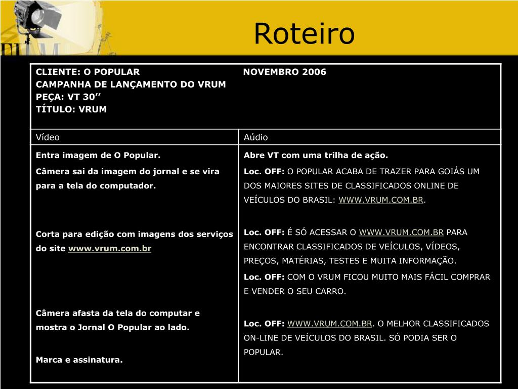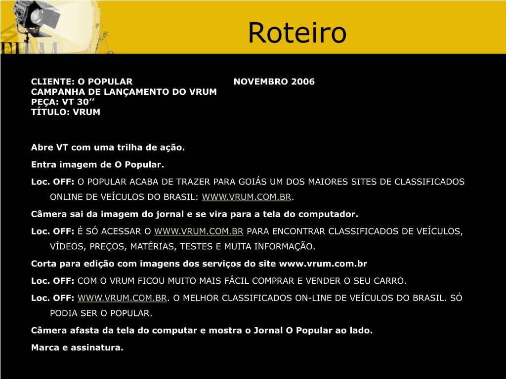 Roteiro CLIENTE: O POPULAR NOVEMBRO 2006 CAMPANHA DE LANÇAMENTO DO VRUM PEÇA: VT 30’’ TÍTULO: VRUM Abre VT com uma trilha de ação. Entra imagem de O Popular. Loc. OFF: O POPULAR ACABA DE TRAZER PARA GOIÁS UM DOS MAIORES SITES DE CLASSIFICADOS ONLINE DE VEÍCULOS DO BRASIL: WWW.VRUM.COM.BR. Câmera sai da imagem do jornal e se vira para a tela do computador. Loc. OFF: É SÓ ACESSAR O WWW.VRUM.COM.BR PARA ENCONTRAR CLASSIFICADOS DE VEÍCULOS, VÍDEOS, PREÇOS, MATÉRIAS, TESTES E MUITA INFORMAÇÃO. Corta para edição com imagens dos serviços do site www.vrum.com.br Loc. OFF: COM O VRUM FICOU MUITO MAIS FÁCIL COMPRAR E VENDER O SEU CARRO. Loc. OFF: WWW.VRUM.COM.BR. O MELHOR CLASSIFICADOS ON-LINE DE VEÍCULOS DO BRASIL. SÓ PODIA SER O POPULAR. Câmera afasta da tela do computar e mostra o Jornal O Popular ao lado. Marca e assinatura.