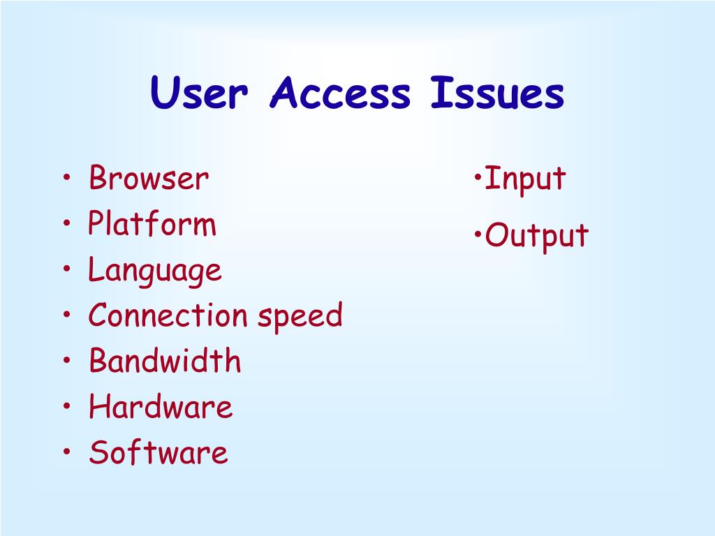 User Access Issues • Browser • Platform • Language • Connection speed • Bandwidth • Hardware • Software • Input • Output