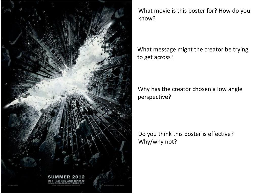 What movie is this poster for? How do you know? What message might the creator be trying to get across? Why has the creator chosen a low angle perspective? Do you think this poster is effective? Why/why not?