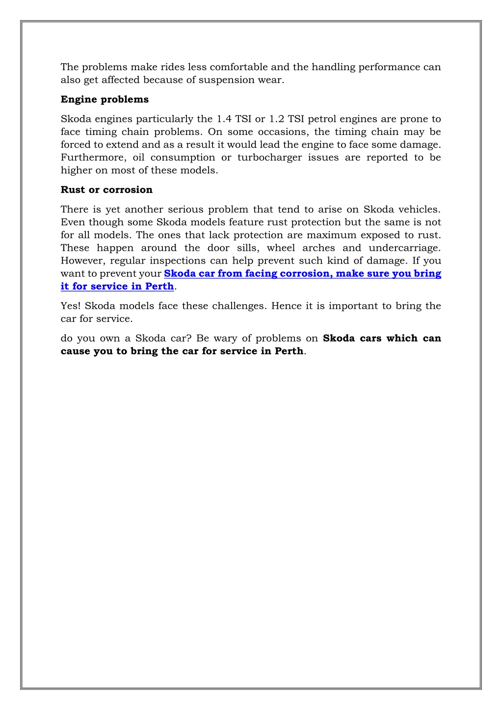 2. The problems make rides less comfortable and the handling performance can also get affected because of suspension wear. Engine problems Skoda engines particularly the 1.4 TSI or 1.2 TSI petrol engines are prone to face timing chain problems. On some occasions, the timing chain may be forced to extend and as a result it would lead the engine to face some damage. Furthermore, oil consumption or turbocharger issues are reported to be higher on most of these models. Rust or corrosion There is yet another serious problem that tend to arise on Skoda vehicles. Even though some Skoda models feature rust protection but the same is not for all models. The ones that lack protection are maximum exposed to rust. These happen around the door sills, wheel arches and undercarriage. However, regular inspections can help prevent such kind of damage. If you want to prevent your Skoda car from facing corrosion, make sure you bring it for service in Perth. Yes! Skoda models face these challenges. Hence it is important to bring the car for service. do you own a Skoda car? Be wary of problems on Skoda cars which can cause you to bring the car for service in Perth.